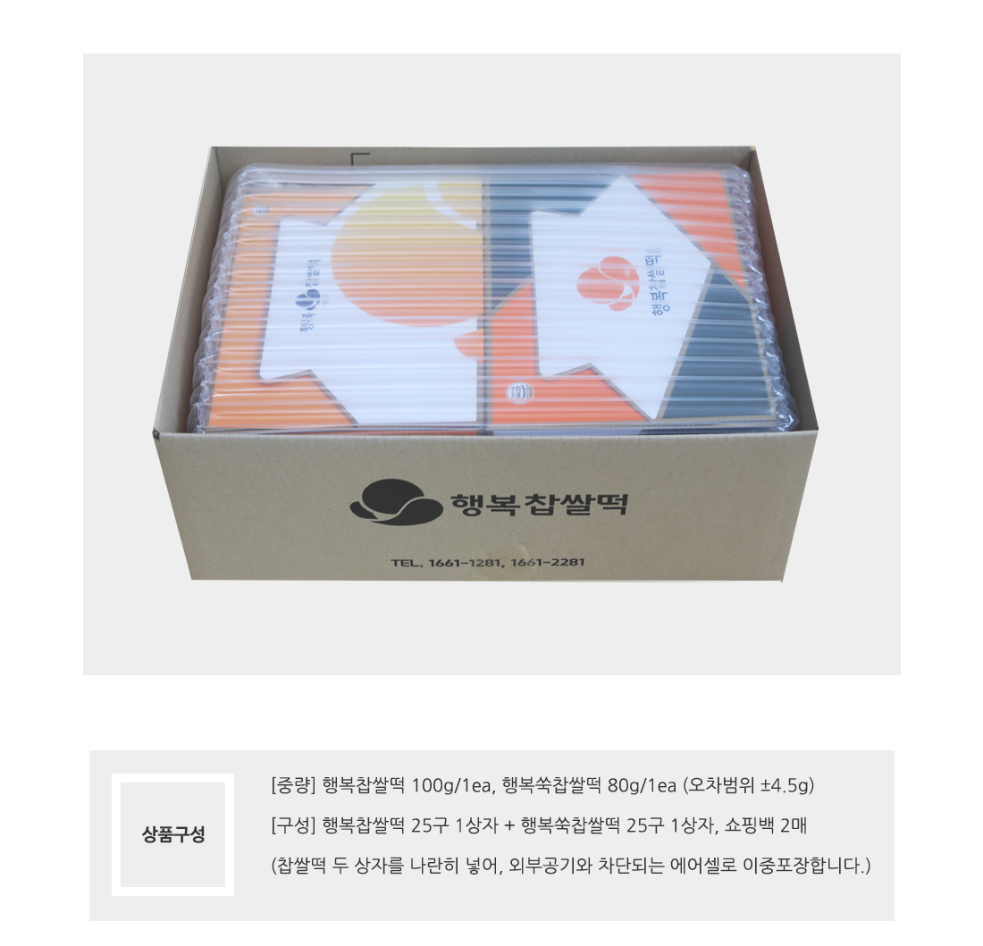 바로 주문하기 수량 + 추가 옵션 선택 행복찹쌀떡 25개 상자 선택안함 행복찹쌀떡 25개 (오리지널 흰찹쌀떡)(+37,500) 행복찹쌀떡 20개 상자 선택안함 행복찹쌀떡 20개 상자 (오리지널 흰찹쌀떡)(+30,000) 행복찹쌀떡 10개 상자 선택안함 10개 소포장상자 (오리지널 상자값 500원 포함)(+15,500) 행복찹쌀떡 10개 봉지 선택안함 10개 봉지 (오리지널)(+15,000) 쑥찹쌀떡 25개상자 옵션 선택 쑥찹쌀떡 25개 상자(+42,500) 쑥찹쌀떡 20개 상자 옵션 선택 쑥찹쌀떡 20개 상자(+34,000) 쑥찹쌀떡 10개 상자 옵션 선택 쑥찹쌀떡 10개 상자 (상자값 500원포함)(+17,500) 쑥찹쌀떡 10개 봉지 옵션 선택 쑥찹쌀떡 10개 봉지(+17,000) 옵션 적용가 80,000원 장바구니 담기 바로 주문하기